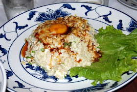 再來是特色菜「賽螃蟹」,基本上是蟹肉和蛋清抄,上桌再拌上蛋黄及醬料夾入包子吃,方出爐的包子吸入抄蟹肉的汁,可口美味極了,我每次都覺得要他多配三個包子才行。